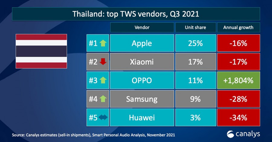 OPPO เผยอัตราการเติบโตยอดขายหูฟัง TWS สูงสุดของประเทศไทย ในไตรมาสที่ 3 ปี 2564 โดยมีอัตราการเติบโตเฉลี่ยต่อปีเพิ่มขึ้นถึง 1,804% อ้างอิงจากการรายงานของ Canalys โดยผลิตภัณฑ์หูฟัง TWS ของ OPPO นั้นล้วนเป็นผลิตภัณฑ์ที่ออกแบบมาโดยคำนึงถึงผู้ใช้งานเป็นหลัก ตามกลยุทธ์สำคัญของ OPPO ที่มุ่งตอบโจทย์ความต้องการของกลุ่มเป้าหมายในทุกส่วน ทำให้ OPPO สามารถเติบโตได้อย่างรวดเร็วและไม่หยุดยั้ง