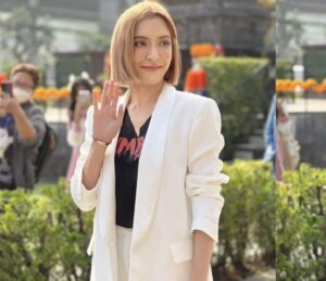 “พิ้งกี้ สาวิกา” สวมใส่สูทสีขาว มากับลุคผมสั้นสีทองสะดุดตา สวยสดใสพร้อมส่งยิ้มสดใส ซึ่งอาจรอยยิ้มของการปลดล็อกกำไลอีเอ็ม หลังได้ความสะดวกในการรับงานแสดง